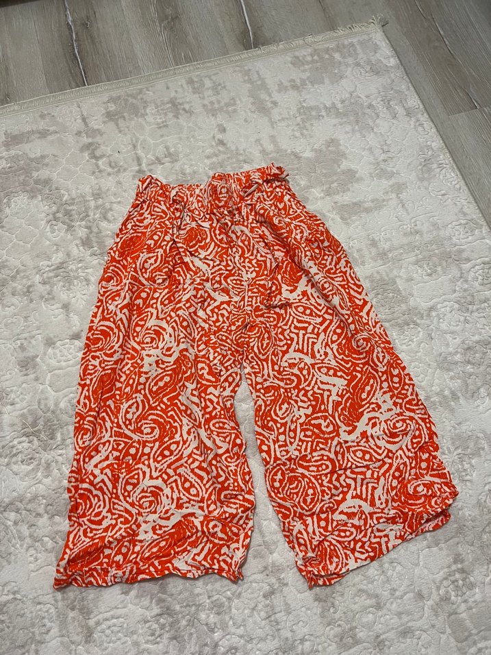 Renkli kırmızı bağlama desenli, dantel detaylı, yumuşak dokulu, bol kesim uzun kadın pantolonudur. Dış mekan kullanımı için uygundur.