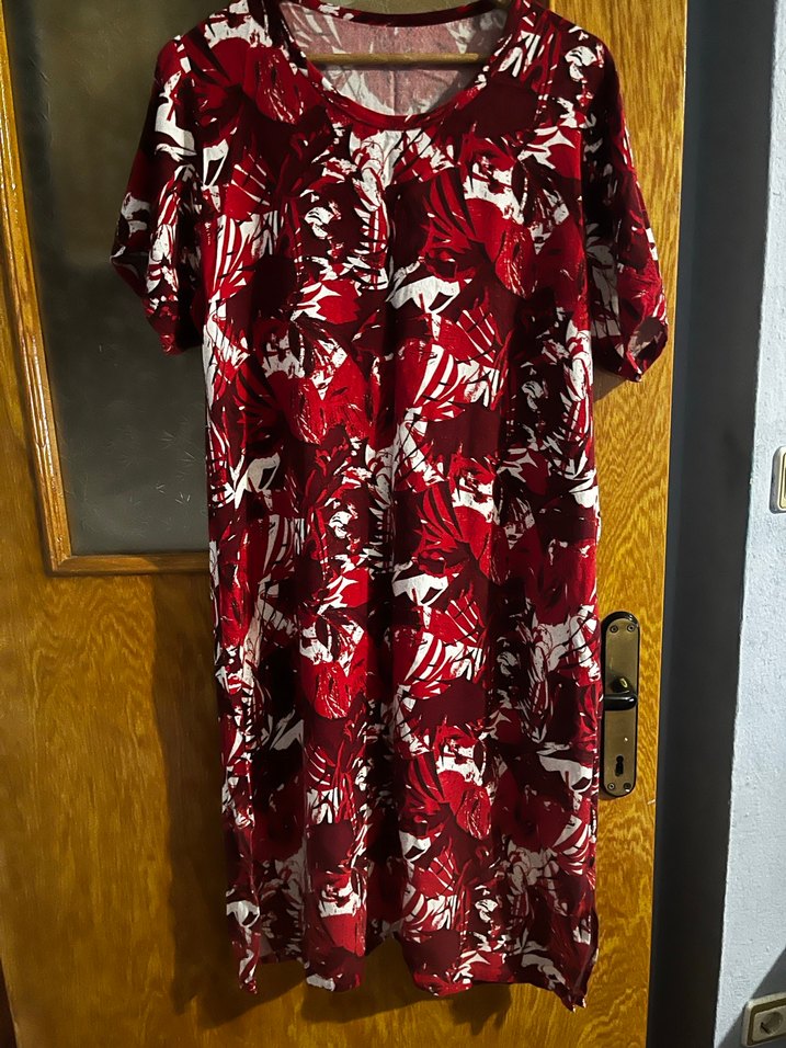 Koyu kırmızı bağlama desenli, V yakalı ve kısa kollu, sentetik kumaştan üretilmiş bol kesim uzun bohem tarzda elbise. Boy 102 iki koltuk arası 52