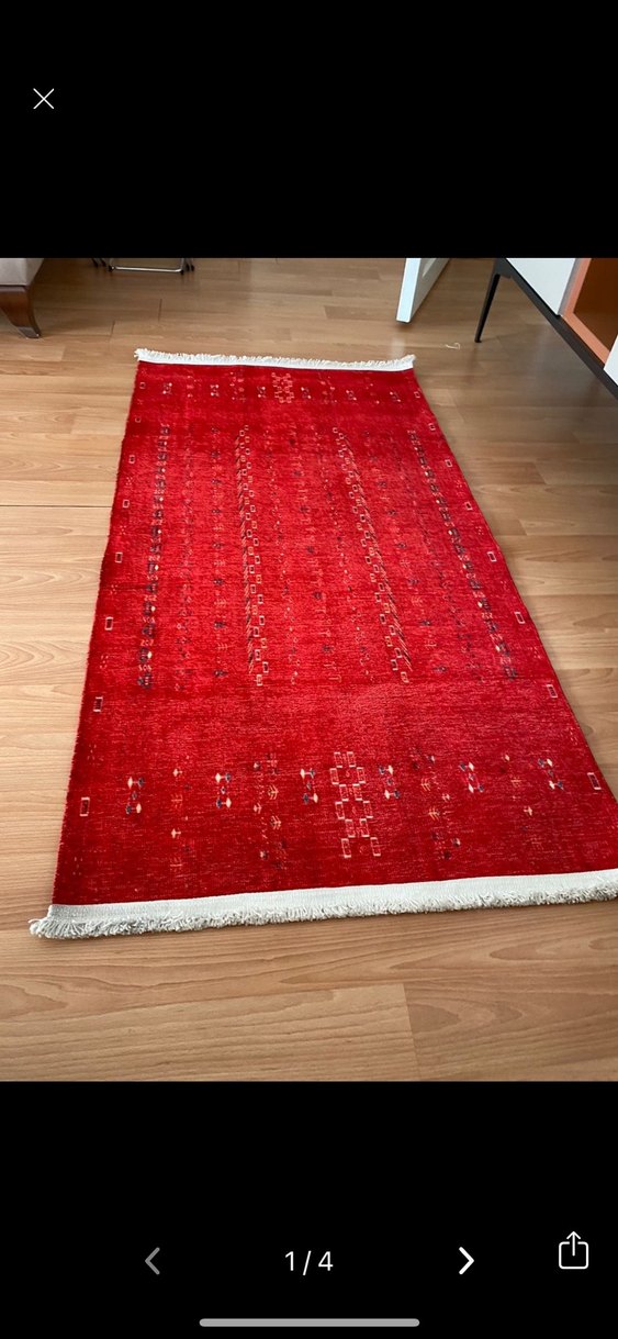 Kırmızı zemin üzerine renkli bağlama desenleri bulunan geleneksel halı, her iki ucunda beyaz püsküllerle tamamlanmıştır.