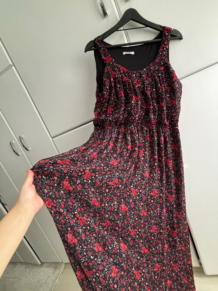 Kırmızı bağlama desenli, askısız ve bol kesim hamile midi elbise, rahat günlük kullanım için uygundur.