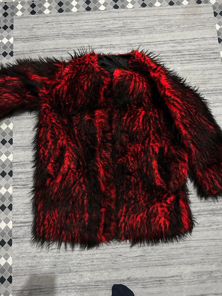 Kırmızı bağlama desenli, kürk kumaştan üretilmiş, uzun kollu, normal boyda ve oturan kesimde kadın ceketi. Parti için uygun şık bir model.