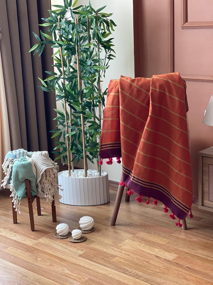 Kenarlarında püsküller bulunan canlı kırmızı bağlama desenli renkli peştemal , ortama sıcaklık ve şıklık katar.(hamamda denizde kullanılabilir ketendir)