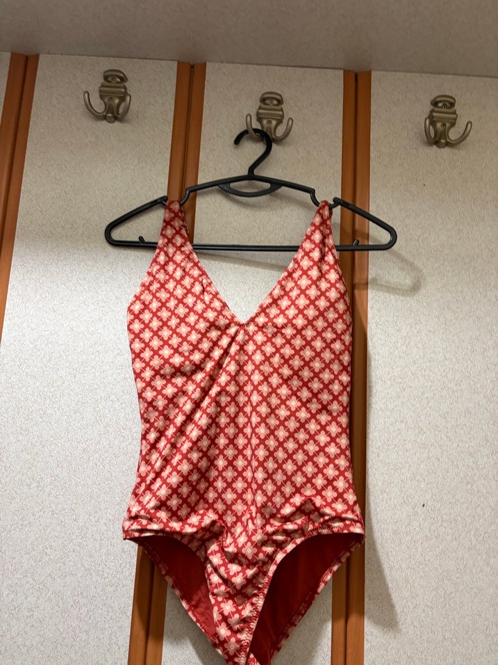 Kırmızı bağlama desenli, ince askılı ve midi uzunlukta, bohem tarzda rahat bir mayo.