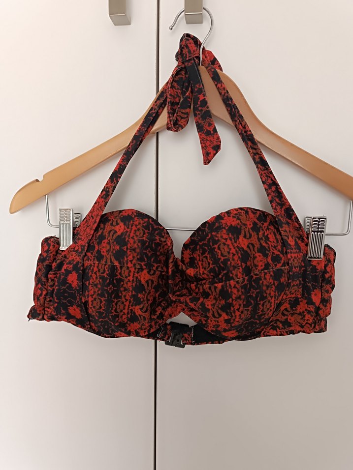 Koyu kırmızı tie-dye desenli, bağlamalı ve tokalı detaylara sahip, bohem tarzda oturan bikini üstü.