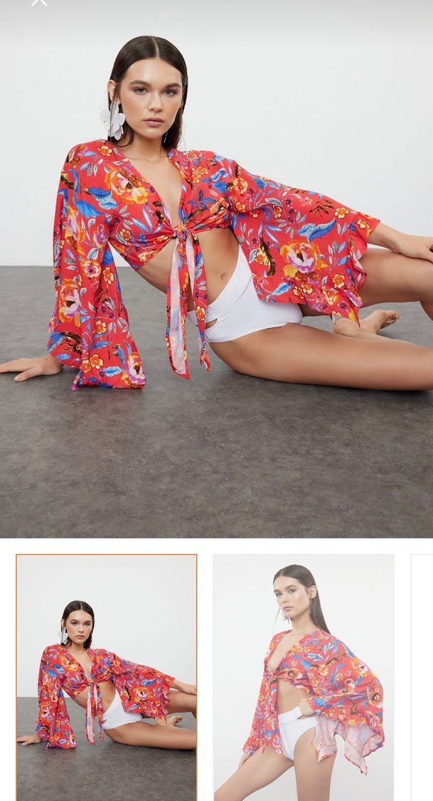 Kırmızı tie-dye desenli, bağlamalı, kısa ve bol kesim tulum. Drapeli ve askılı kollara sahip, bohem pop kültür tarzında, açık hava için uygun.