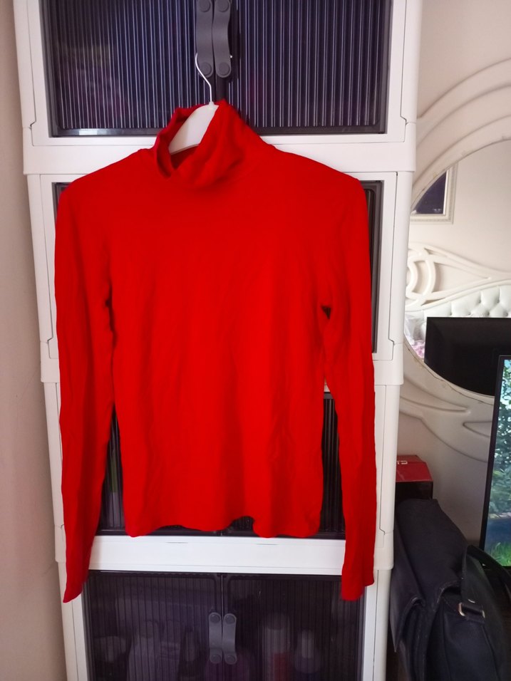 Bu kırmızı, balıkçı yakalı kadın badyuzun kollu ve vücuda oturan kesime sahiptir. Yumuşak ve sıcak kumaştan yapılmış, normal midi boyda ve minimalist tarzda, günlük kullanım için uygundur. Boy 52 cm M beden Göğüs 88cm uzunkolu60cm