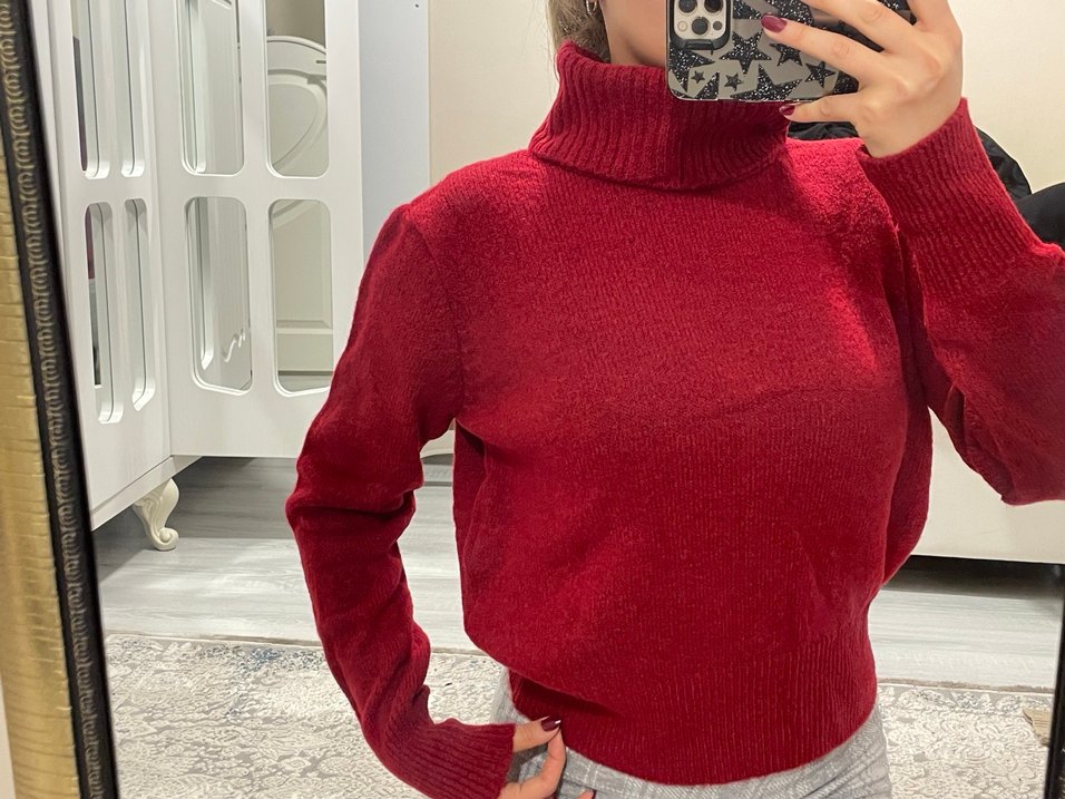 Kırmızı Balıkçı Yaka Kadın Triko Kazak