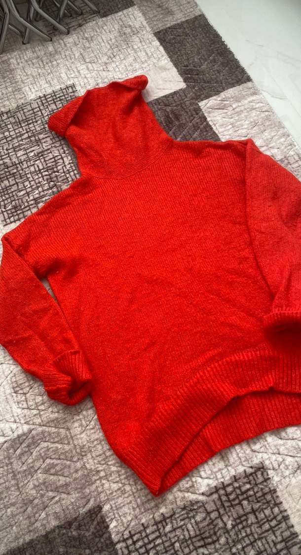 Kırmızı balıkçı yaka, uzun kollu, bol kesim örme triko kazak, rahat ve sade tarz için idealdir. Rengi turuncu ile kırmızı arasında bir renktir