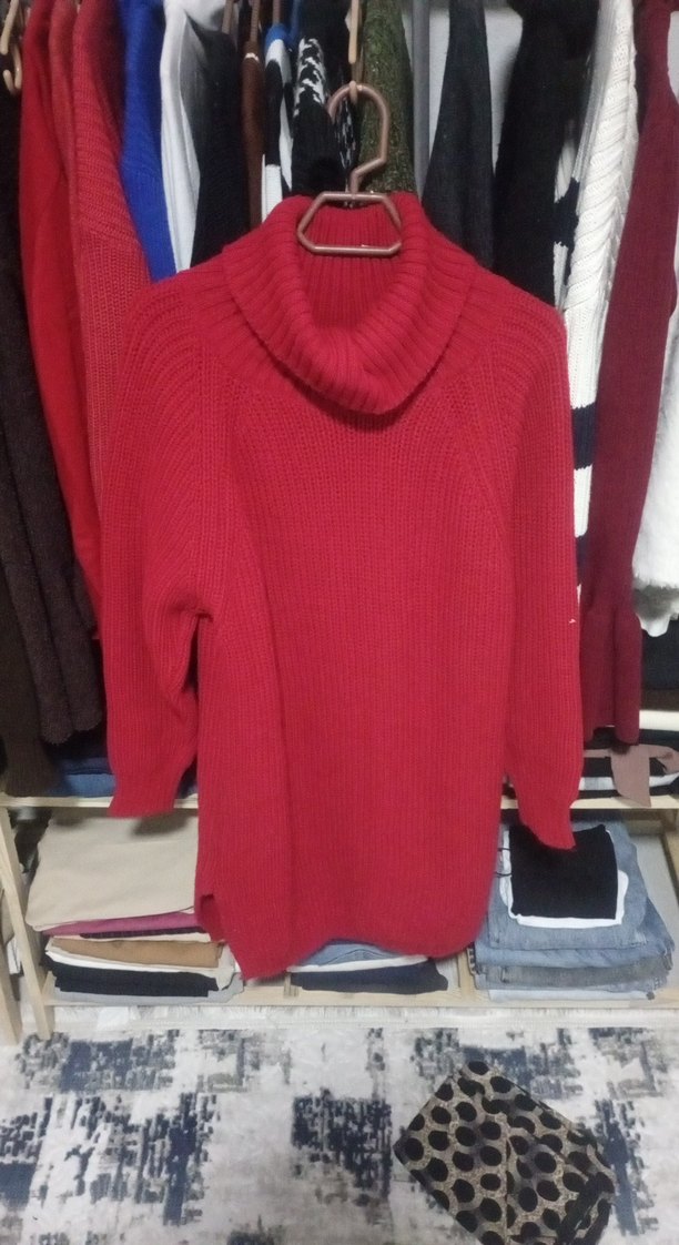 Kırmızı renkli, balıkçı yaka ve uzun kollu örgü kadın kazak. Gevşek kesim ve midi boyda, rahat ve şık günlük sokak stili için uygundur.