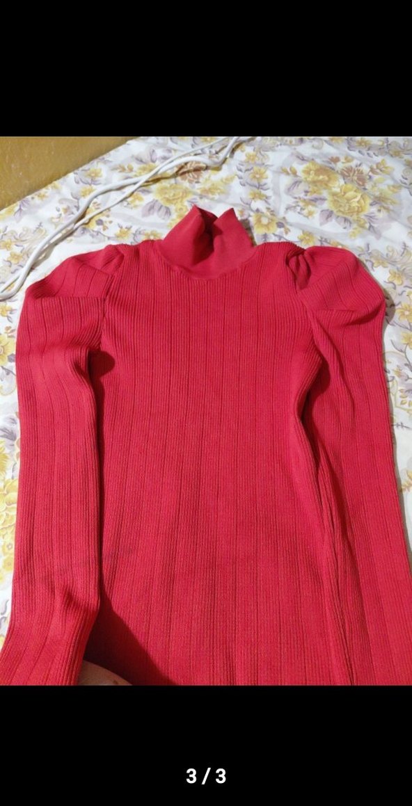 Kırmızı, balıkçı yaka, uzun kollu, triko kumaştan yapılmış, sade ve renkli, günlük kullanıma uygun, normal midi boyda, vücuda oturan kadın kazak.