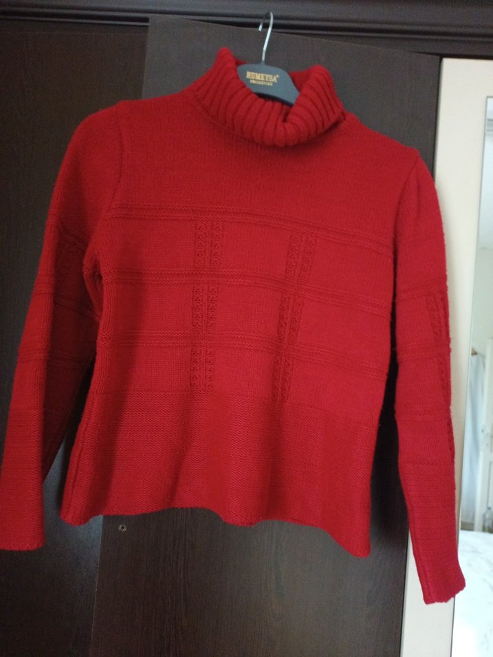 Kırmızı triko kadın kazak, balıkçı yaka ve uzun kolludur. Fitted kesimi ve sade dokusu ile günlük kullanıma uygundur.