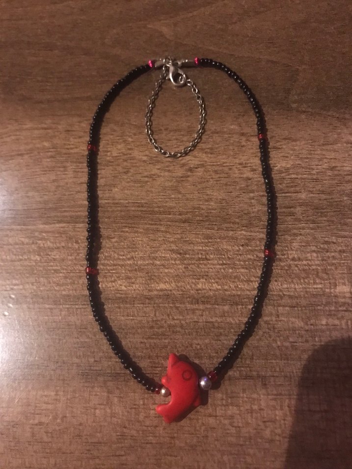 Bu çocuk kolyesi, kırmızı bir balık ve siyah boncuklardan oluşur. Normal midi uzunluğundadır, minimal, bohem