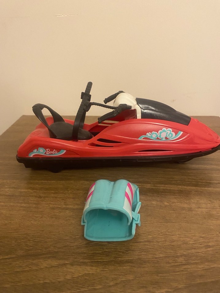 Kırmızı gövdesi ve mavi-beyaz çiçek desenleri olan Barbie oyuncak jet ski, çıkarılabilir açık mavi koltuğa sahiptir.