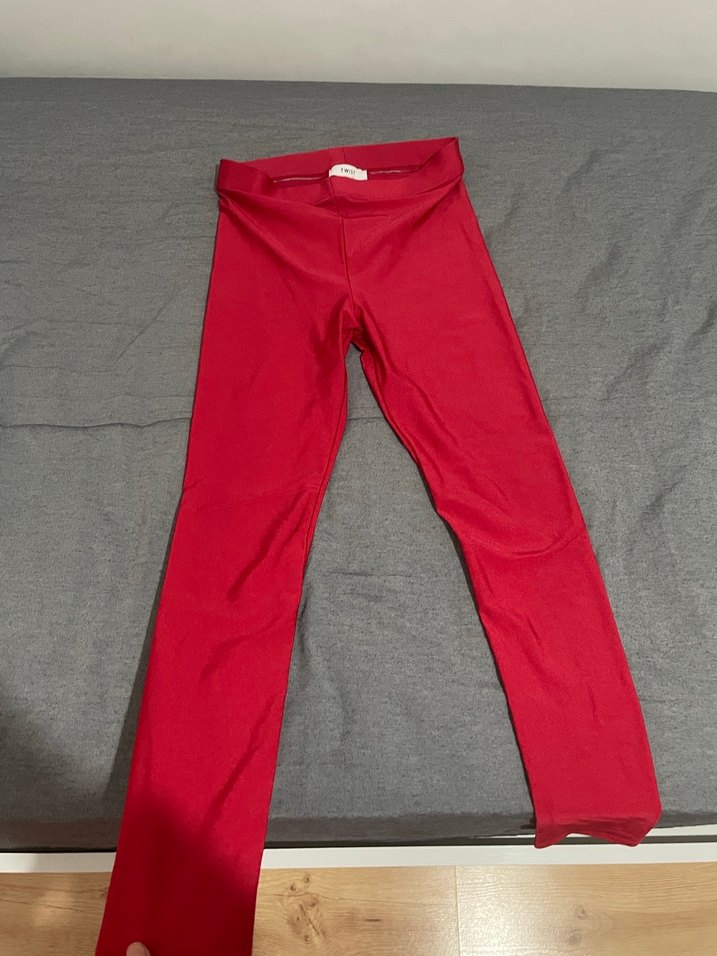 Kadınlar için kırmızı, elastik sentetik kumaştan yapılmış, spor için uygun, normal midi boyda, sade ve desensiz tayt. Parlak kumaştır 36 beden vücudu sarar