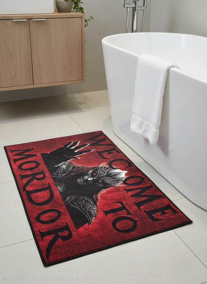 Koyu kırmızı renkli, "MORDOR" yazılı baskılı banyo paspası, banyonuza karakter katıyor.