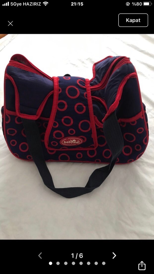 Kırmızı ve lacivert renklerde, baskılı daire desenli, siyah omuz askılı bebek çantasıdır. Bebek eşyalarını taşımak için uygundur.