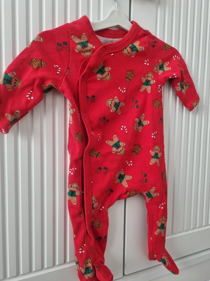 Kırmızı renkli, baskılı desenli bebek tulumu, uzun kollu ve yuvarlak yakalıdır. Düğmeli tasarımı kolay giydirme sağlar, yumuşak ve sıcak kumaştan yapılmıştır.