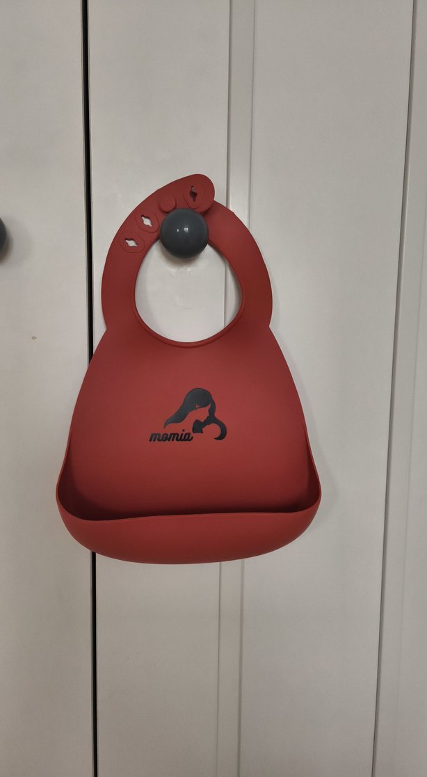 Ayarlanabilir boyun kapamalı, kırmızı baskılı bebek önlüğü. Momia yazısı ve kırıntı tutan cep içerir. ️
