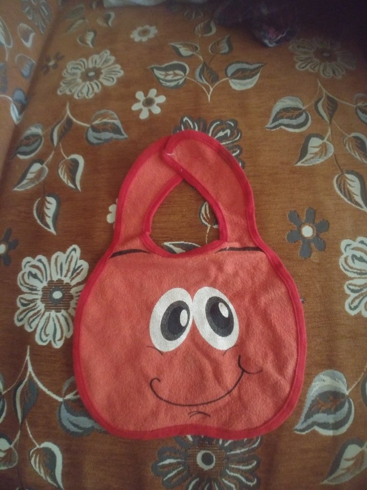 Yumuşak kumaştan, renkli baskılı gülen yüz deseniyle kırmızı bebek önlüğü, yemek sırasında bebeklerin temiz kalmasını sağlar.