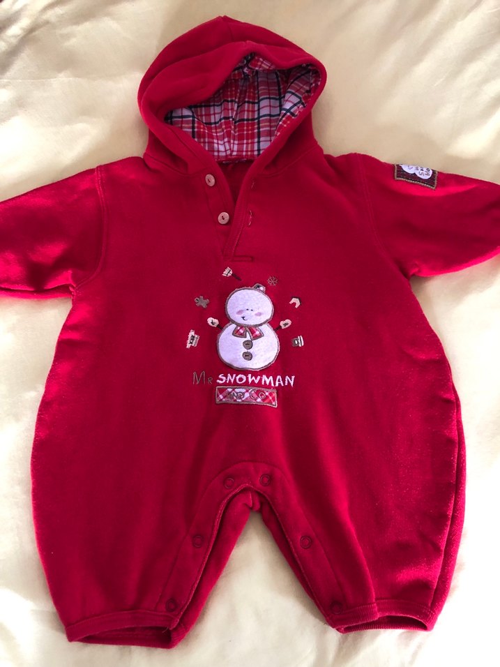 Renkli baskılı, düğmeli kırmızı bebek tulumu. Kapüşonlu ve ekose astarlı, kar temalı rahat bir tasarım. ❄️