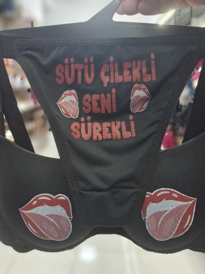 Kırmızı, parlak baskılı yazılar ve dudak desenleriyle biker tarzı, midi uzunlukta kadın iç çamaşırı. Grunge punk havası taşıyor.