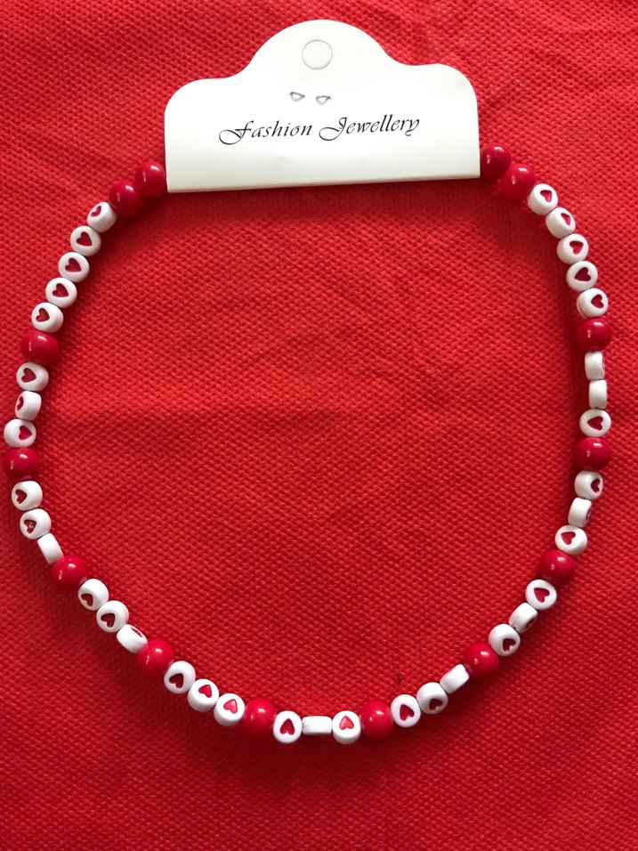 Kırmızı ve beyaz baskılı kalp desenli boncuklardan oluşan uzun kolye, bohem tarzınıza renkli ve minimalist dokunuş katar. ❤️