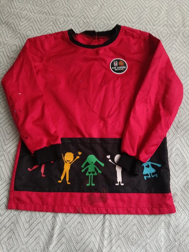 Kırmızı renkli, uzun kollu boyama önluk, birkaç yerinde boya izleri mevcut fiyata yansıtıldı ,marka temsilidir.