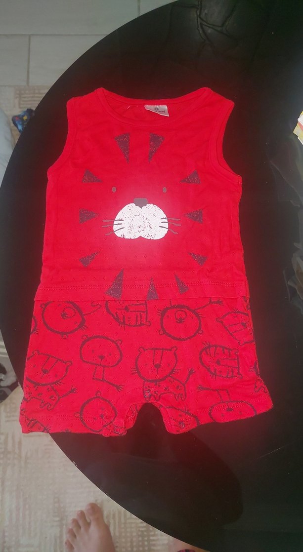 Kırmızı renkli, baskılı aslan yüzü ve eğlenceli hayvan desenli çocuk atletidir.