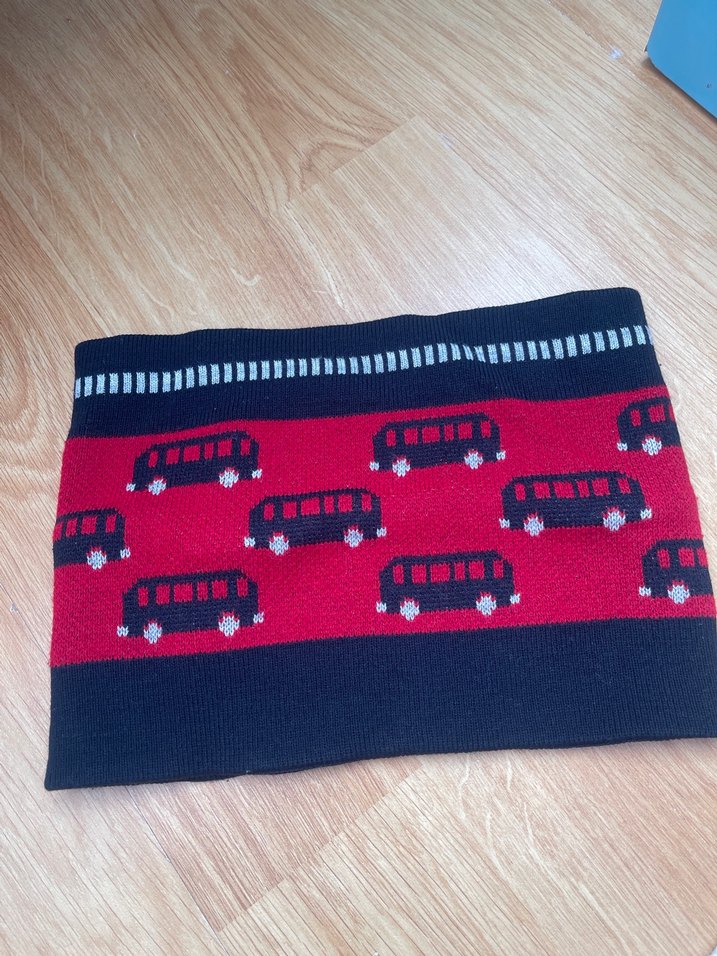Koyu kırmızı renkli, otobüs baskılı örgü çocuk boyunluğu Yumuşak ve rahat kullanıma uygun. Hiç bir sıkıntısı yok sıfırdan farksız