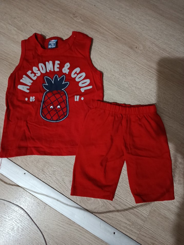 Renkli kırmızı pamuklu kumaştan, kolsuz ve straplez üst ile baskılı ananas desenli, örme şortlu erkek bebek takımı.