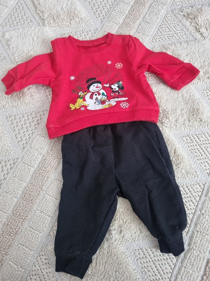 Kırmızı renkli, bisiklet yakalı, uzun kollu, örme üst kısmı baskılı, siyah yumuşak kumaş pantolonlu renkli bebek erkek takımı.