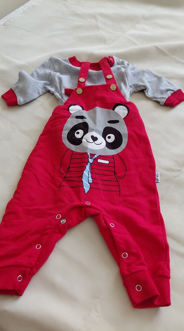 Uzun kollu, yuvarlak yakalı kırmızı baskılı erkek bebek tulumu, düğmeli ve renkli tasarıma sahip.