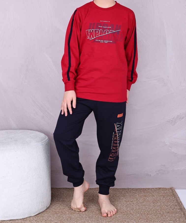 Kırmızı, baskılı sweatshirt ve siyah eşofman altından oluşan, yumuşak ve rahat kumaşlı erkek çocuk eşofman takımı. Salaş kesimi ve bisiklet yaka tasarımıyla renkli ve şık bir sokak stili sunar. "EXPIAE" yazısı baskılıdır.