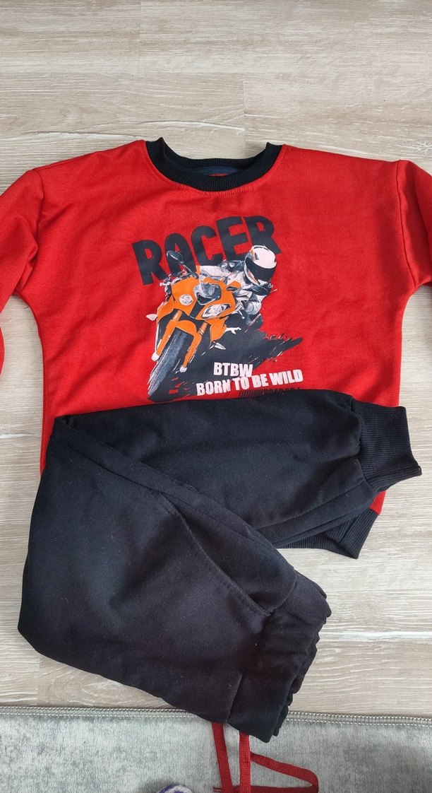 Bol kesim, bisiklet yaka, kırmızı baskılı sweatshirt ve siyah örme kumaşlı eşofmandan oluşan, yumuşak ve sıcak kumaştan yapılmış erkek çocuk eşofman takımı. ️ Kullanılmamış