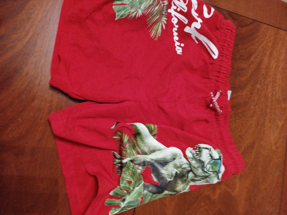 Kısa kollu, elastik bel bantlı kırmızı erkek çocuk mayosu, renkli dinozor ve palmiye yaprağı baskılıdır.