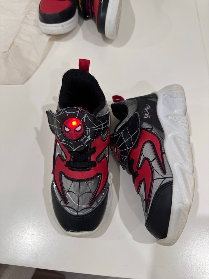 Baskılı örümcek ağı desenli kırmızı renkli, cırt cırtlı erkek çocuk spor ayakkabısı. Kauçuk tabanlı, rock punk tarzına uygun ışıklıdır