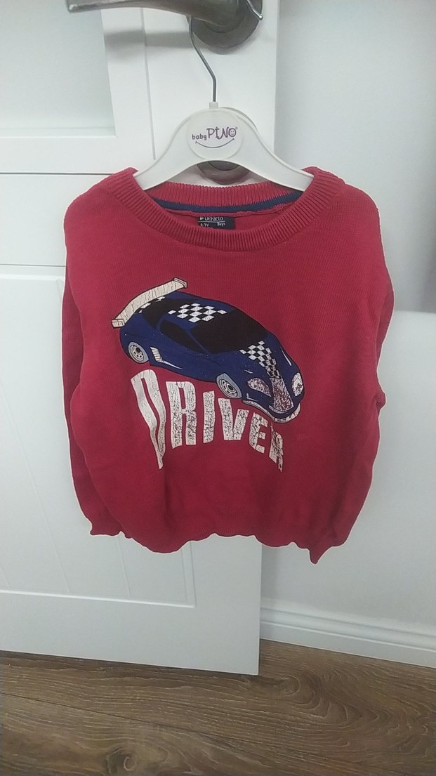 Kırmızı renkli, bol kesim uzun kollu erkek çocuk sweatshirtü. Örme bisiklet yaka ve renkli baskılı araba deseni bulunur. Yumuşak ve sıcak kumaş kullanılmıştır.