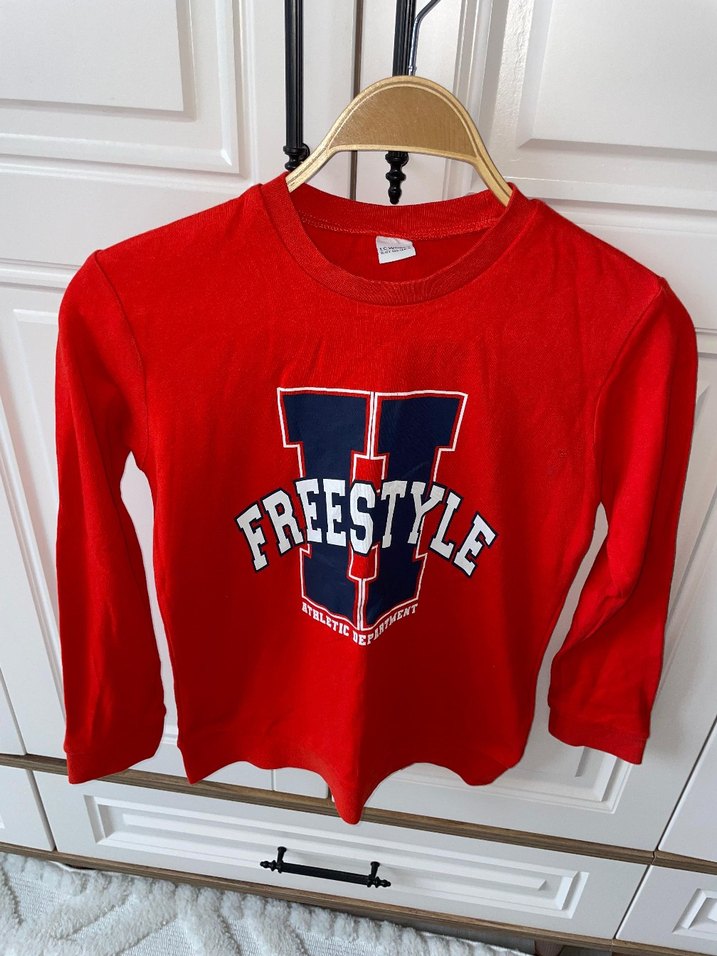 Kırmızı, uzun kollu, yuvarlak yaka erkek çocuk sweatshirtü. Renkli baskılı "FREESTYLE" yazısı ve rahat kesimiyle günlük kullanım için uygundur. reaimde görülen nokta kadar delik var sadece 1 kez giyildi