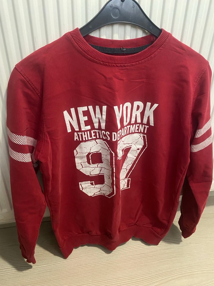 Dar kesim kırmızı sweatshirt, uzun kollu ve yuvarlak yakalıdır. Örme dokusu ve "NEW YORK ATHLETICS DEPARTMENT 97" baskısı mevcuttur. Spor ve günlük kullanıma uygundur. ♀️