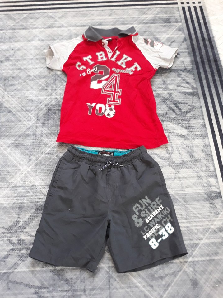 Kırmızı baskılı kısa kollu tişört ve baskılı detaylı gri şort, belden bağlamalıdır. sayfama bakın istediğiniz konbin yapasım