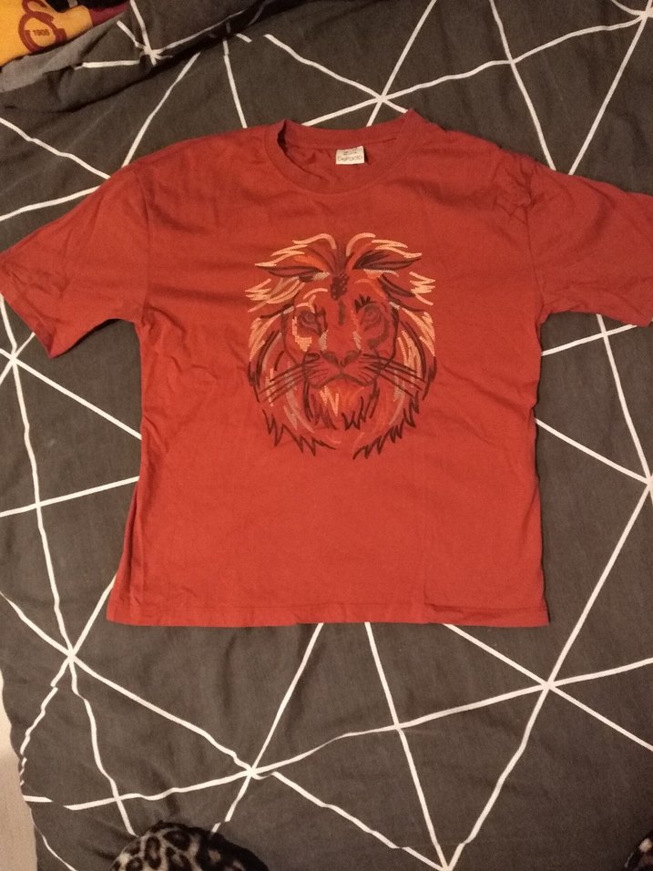 Bu erkek çocuk tişörtü, kısa kollu ve yuvarlak yakalıdır. Kırmızı renkte, önünde aslan baskısı vardır ve yumuşak, sıcak kumaştan üretilmiştir.