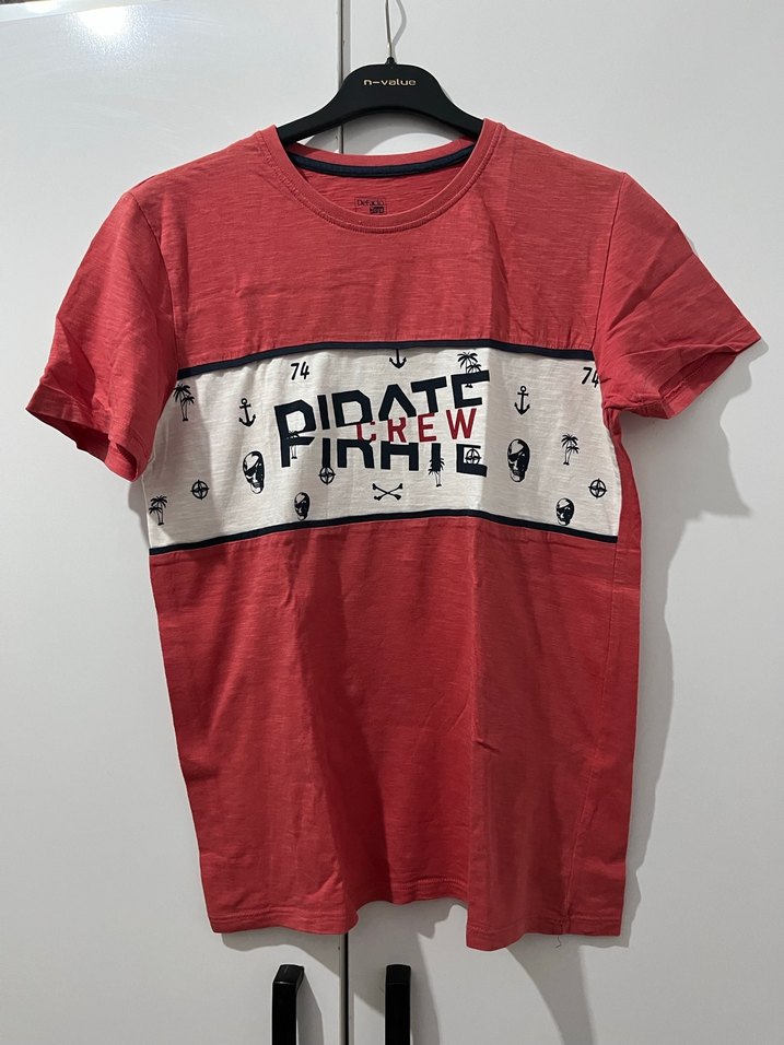 Kırmızıya yakın bir renkli, kısa kollu ve bol kesim erkek çocuk tişörtü. Sentetik kumaş üzerine korsan temalı baskılar ve '74 PIRATE' yazısı bulunur. ☠️