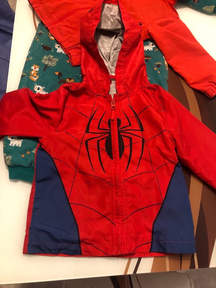Fermuarlı, yüksek yakalı, baskılı örümcek desenli, kırmızı ve koyu mavi renklerde, yumuşak ve sıcak kumaştan erkek çocuk yağmurluğu. ️