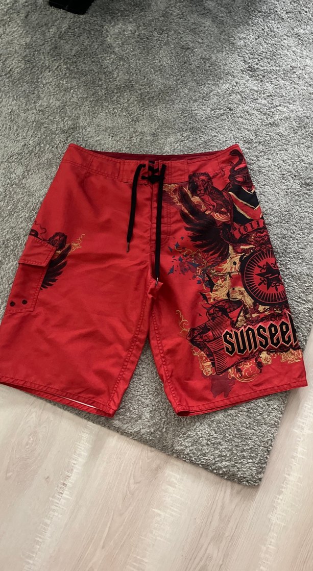 Kırmızı, baskılı ve kemerli bu erkek deniz şortu, bol kesimiyle cesur athleisure tarzı plaj giyiminde dikkat çeker. Yanında 'sunsee' yazısı bulunur.