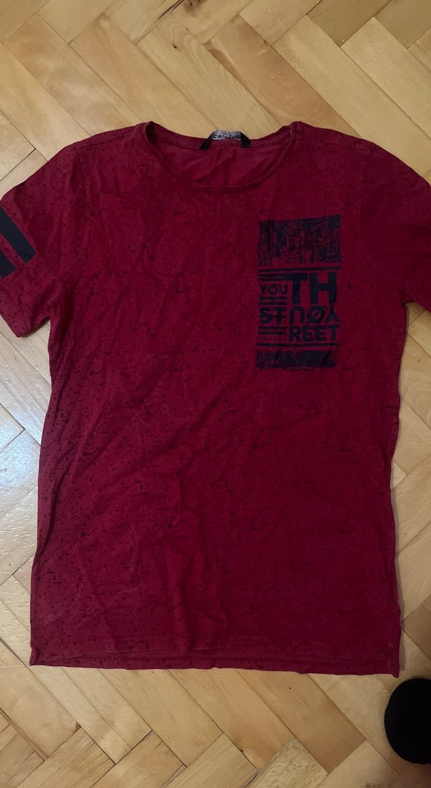Kırmızı renk, yuvarlak yaka ve kısa kollu erkek tişörtü. Göğüs ve kollarda baskılı desenler bulunur. Rahat kesimli, günlük sokak tarzına uygun.