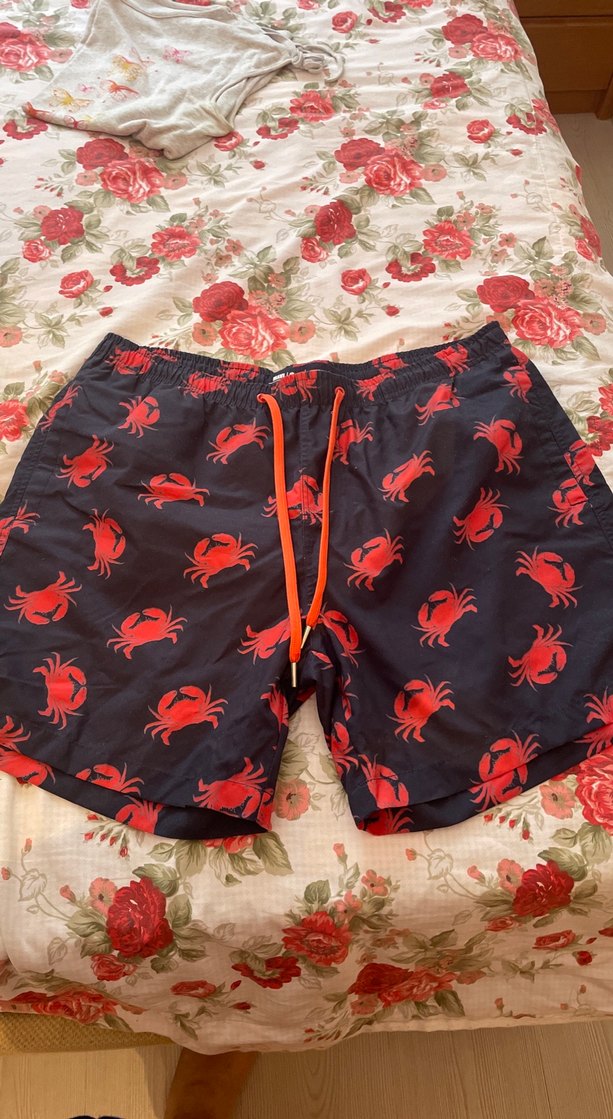 Renkli kırmızı yengeç baskılı, kemerli, dar kesim erkek mini mayo şort.
