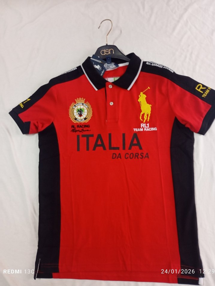 Kırmızı ve siyah yan panelli, baskılı, kısa kollu, yakalı ve yapışkan bantlı erkek polo tişörtü. pamuk kumaştan, sportif ve normal kesimdir. İtalyan yarış temalı baskılar nakışlar içerir.