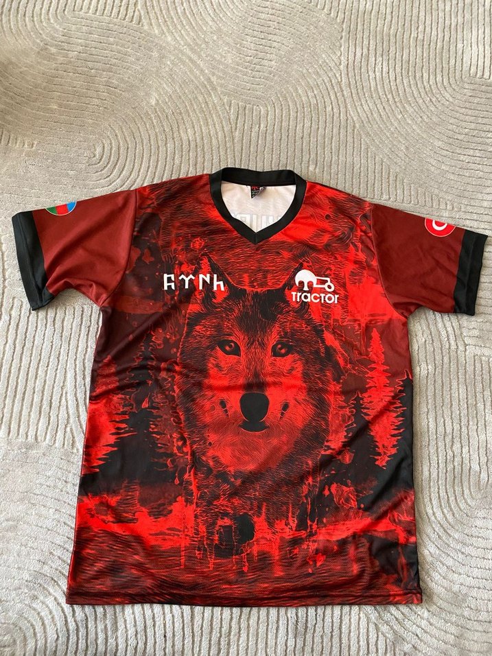 Koyu kırmızı baskılı, sentetik kumaştan erkek spor tişörtü. Rahat kesim, kısa kollu ve yuvarlak yakalı, kurt desenli ve "TracTO" yazılıdır.