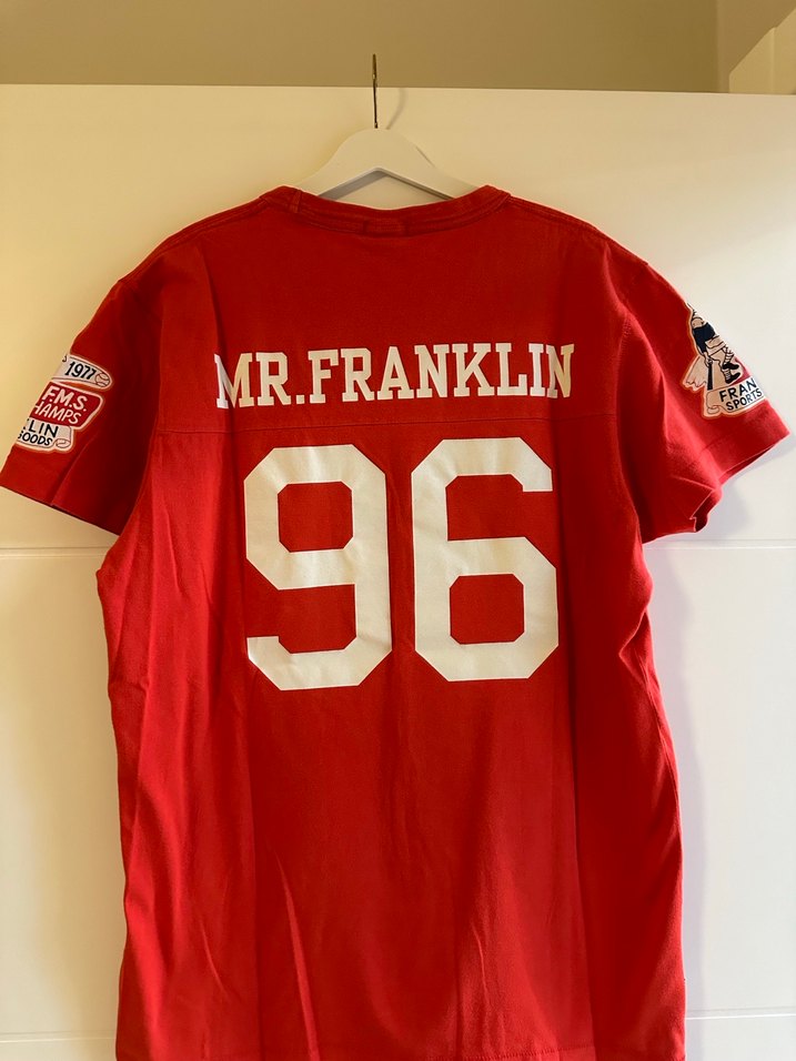Kırmızı kısa kollu, yuvarlak yakalı erkek tişörtü. "MR.FRANKLIN" ve 96 numara baskılı, zincir detaylı, rahat kesim. Spor ve günlük kullanıma uygun. Orjinal