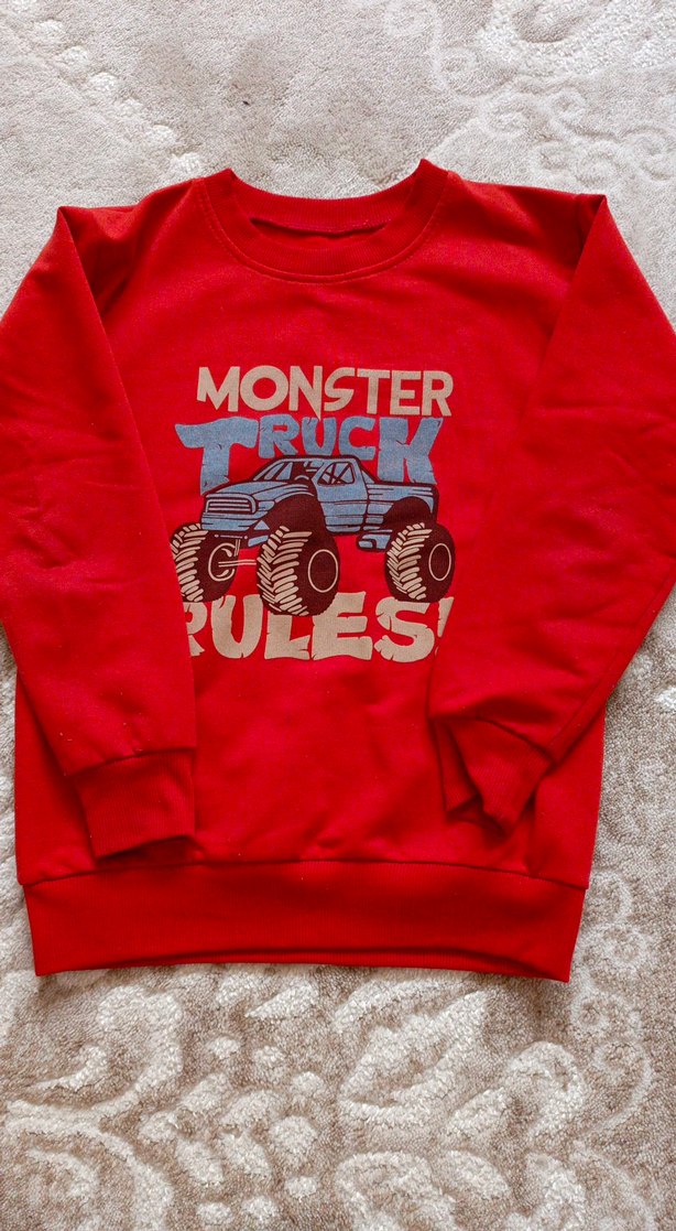 Kırmızı, uzun kollu, yuvarlak yaka ve bol kesim erkek sweatshirtü. Yumuşak ve sıcak kumaştan, renkli canavar kamyon baskılı ve tokalı detaylıdır. hiç bir sorunu yok ihtiyaç dışı olduğu için satıyorum